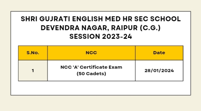 SHRI GUJRATI ENG. MED. HR. SEC. SCHOOL, DEVENDRA NAGAR, RAIPUR, C.G., N.C.C PARTICIPANTS RECORD SHEET , SESSION 2023-24 |
