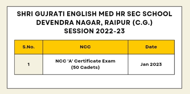 SHRI GUJRATI ENG. MED. HR. SEC. SCHOOL, DEVENDRA NAGAR, RAIPUR, C.G., N.C.C PARTICIPANTS RECORD SHEET , SESSION 2022-23 |
